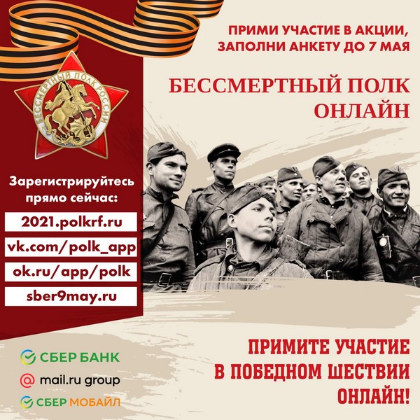 Второй год подряд в силу сложившейся эпидемиологической обстановки в День Великой Победы шествие Бессмертного полка будет организовано в онлайн-формате. Начало трансляции во всех регионах – 9 мая в 15:00 по местному времени. Чтобы ваш герой принял участие в онлайн-шествии и его увидела вся наша страна, необходимо заранее зарегистрироваться. Подробности в карточках, листайте.